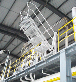 活動(dòng)梯一般裝于棧橋的邊緣,打開(kāi)腳踏鎖緊裝置,松開(kāi)一邊的鐵鏈,放下活動(dòng)梯,將端踏步靠在罐車(chē)上或接近罐車(chē)處,掛上鐵鏈。